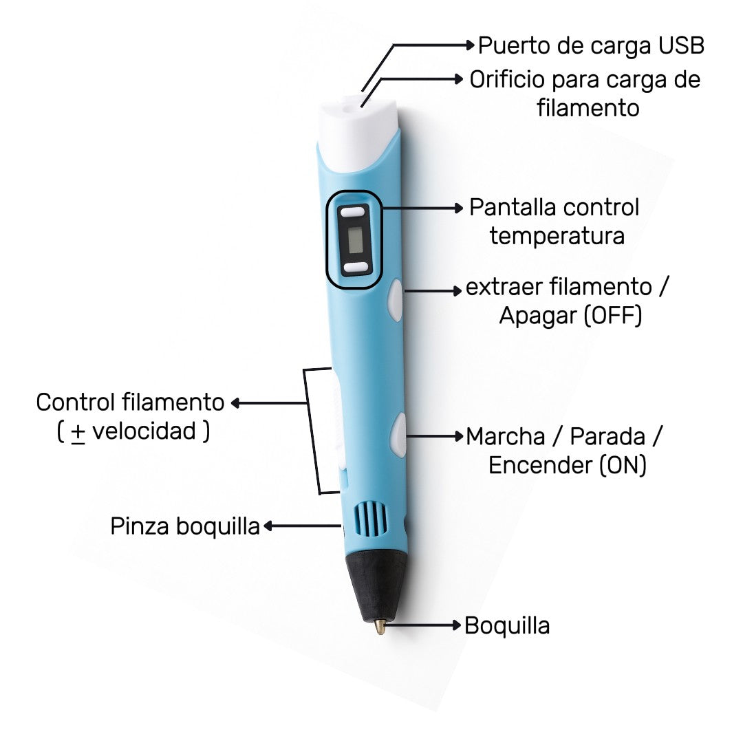 · Contiene varios filamentos de colores, cable de corriente USB, soporte, bolígrafo 3D.